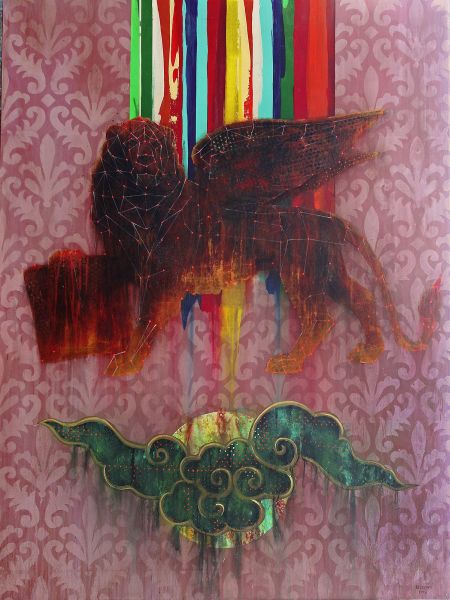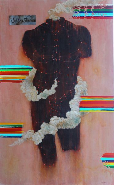 In his work to date Aleksandar Bezinović has presented as an enigmatic painter with a set of motifs that counts on a fragmentation of reality, with some personal elements and systems of phenomenal things close to mechanisms of dream and the fields of the surreal. A search for identity, whatever that might mean, the domains and dangers of technology, the role of art and science in the totality of their development, and finally the role of man in the constellation of the universe are the big themes that can be seen in the motifs chosen, and yet they have no pretensions to be able to give answers and are void of any overtones of emotionality. In his creative work, the artist is clearly attempting to fathom or at least put into a dialogue what it is that occupies us, what it is that resists analysis or any kind of ultimate answer. Drawing heavily on the tradition of figurative painting, including German Expressionism, Metaphysical Painting, Surrealism, Pop Art, the New Image and post-conceptual painting, in a formal sense Bezinović uses ready-made stencils, words in the construction of the semantic layer of the painting, interrelations and references to works from art history and stylistic periods (Antiquity and the Renaissance perhaps reveal his upbringing and formation in Split), sometimes even getting into fields of the grotesque, and occasionally glancing off kitsch through intellectual parody. In an alliance of opposites and of equal intellectual and emotional intensity, the hybrid worlds, strange and poetic at the same time, of this artist’s paintings are opened up before us.