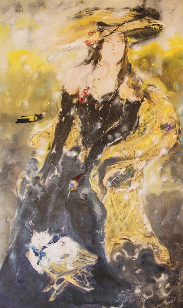 Srđan Vukčević deals primarily with figurative motifs - portraits of historical figures, flirtatious women and overly serious men, vases with flowers, angels and putti, cups, tea kettles, perfume bottles and little boxes, all represnted in the rococo and empire style; fin de siècle fruit baskets, trays, jewelry and ribbons, hats, parasols and dresses; 1920s bathing suits, wicker chairs and beach awnings; dogs, cats and irds, marottes and toys, tables, chairs and sofas, masks and other unusual items. All of these motifs incorporate two basic components we can discern from Srđan's creativity, his environment and his personality, namely the intellectualism and nostalgia.