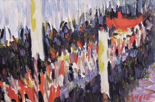THE PROCESSION In painting the paintings containing the motif of a procession, of which there are quite a few, Gusić is presented with the opportunity to bring himself even closer to (his known) self. Likewise, he reveals an artist who successfully equilibrates between two disparate phenomena: at times he is a very accurate observer, inclined to giving realistic accounts and producing in-depth analyses of either the details or the entire complex, whereas at other times he gives himself freely to the enjoyable freedom of playing and the accelerated rhythms of action and colors, thereby coming close to syntheses, stylization and, almost, abstraction.