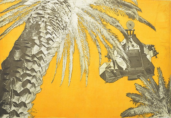 Palms and lunar module, 2017,, digital print on zinc plate, etching and, drypoint, paper, 50 x 70 cm