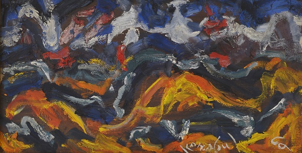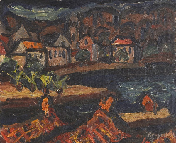 Milan Konjović belongs, according to Protić’s structural diagram, to the expressionism of the newer type, and to the pre-war generation of painters that includes Lubarda, Milunović, Postružnik, Pregelj, Mihalič, Omers, Stupica and Hegedušić. While a parallel phenomenon is that of the expressionist and poetic realism of Milosavljević and Kos, in most of the painters, it is the expression of construction and shaping that prevails, which would refer to Konjović, Bijelić, Dobrović, Job, Šumanović, Babić, Herman, Tartaglia, Gecan, Uzelac, Šulentić and Zora Petrović, as seen in the 1920s, as the plane of contact of the influence of Cézanne, Cubism and the renovated tradition, which, in the case of Konjović, developed in time into the febrile dynamism of Expressionist visions. At the very end of his life and career, with his brush reducing his creative oeuvre of animated geography of motifs, Konjović drew a circle with a dot in the middle: a visual explanation of his mission as painter with a destined calling.